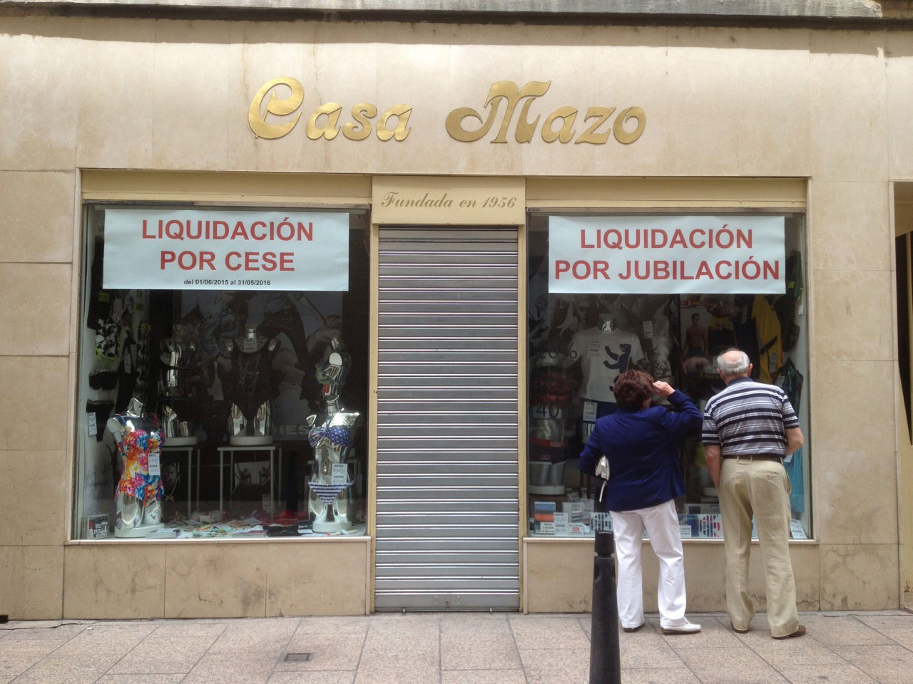 La tienda se llama Casa Mazo y cuenta con su propia historia, ligada en lo más íntimo a la historia de la ciudad que la alberga. Porque quien paseara por la calle Hermanos Moroy tropezaría durante largos años con el escaparate de este comercio textil, que habrá sorprendido a más de un visitante y a más de un indígena con las propuestas que exhibía su singular escaparate. Recuerdo que cuando se lo enseñé a un antiguo amigo era inevitable que cada vez que volviera por Logroño me pidiera que le llevara de nuevo hasta Casa Mazo: aquellos maniquíes que mostraban su ajustada ropa interior dando vueltas sobre sí mismos le tenían fascinado. Culos autómatas que dejarán de girar: así lo anuncia el cartel que decora su frente y que también ilumina estas líneas, cortesía del fotógrafo Justo Rodríguez, que fue quien me dio aviso.