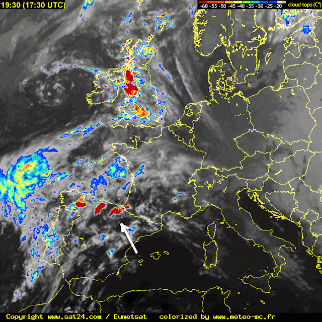 ….y esta tarde como ya dijimos, ha empezado a penetrar aire frío en altura que ha inestabilizado bastante la atmósfera con la formación de tormentas que podíamos ver así en esta animación del radar de la AEMET….