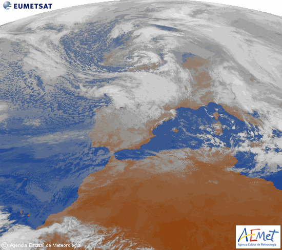 Fijaos en la imágen de masas de aire, del satélite Meteosat, lo bien que se vé…..la masa de aire frío (color rojizo) que nos ha afectado el Jueves….la masa de aire más cálido…(color verdoso) que nos afectará este Viernes….y de nuevo la masa de aire frío que se ve ya para el Sábado….