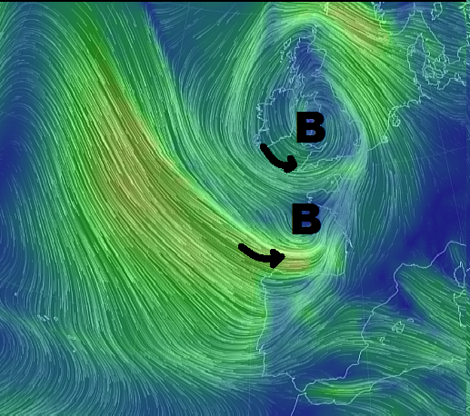 Muy curiosa la situación vivida el Martes con 2 borrascas asociadas, una en el entorno de las Islas Británicas y otra deslizándose por el Cantábrico y generando fuerte vientos y una importante mar de fondo…..