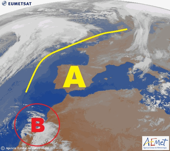 En estos momentos el anticiclón europeo nos afecta de lleno y bloquea el paso de los frentes asociados a borrascas atlánticas que “resbalan” y se deshacen en contacto con las altas presiones.