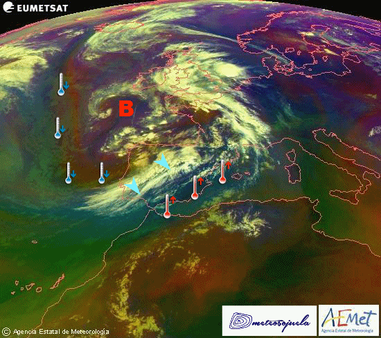Comenzabamos el viernes con bochorno, y temperaturas de nuevo muy altas, que superaban los 35ºC en el valle, pero el desplazamiento de la masa de aire africano (color azul-verdoso) por otra más fresca procedente del Atlántico (color rojizo) y acompañada de vientos del W-Nw dio lugar a grandes contrastes entre el viernes y el sábado…