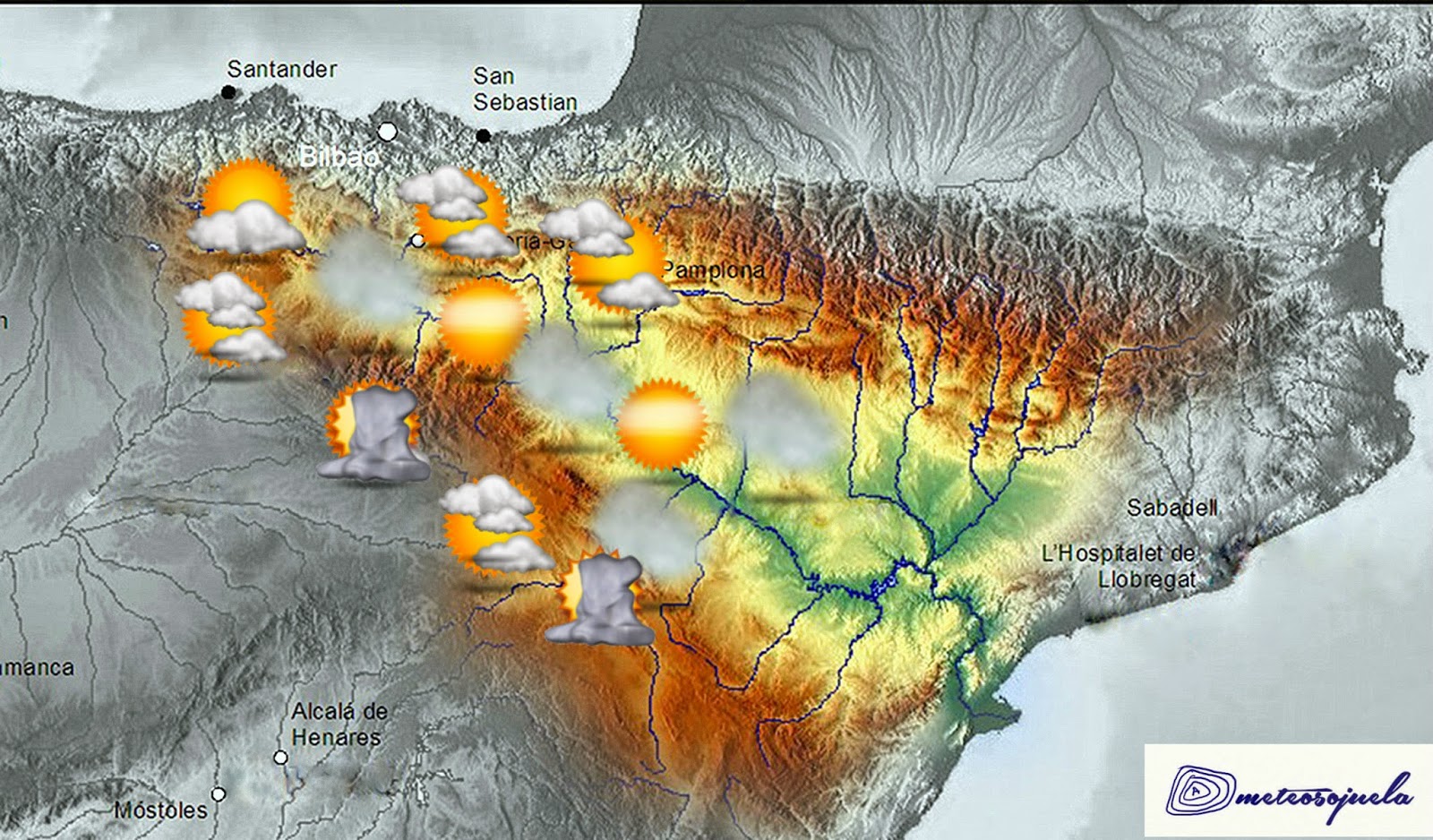 Con estos vientos, en nuestra región, se acumularán nubes, sobre todo en zonas de montaña y Rioja Alta, quedando con más claros en el valle. Tambien al mediodía se espera que sol prevalezca sobre las nubes.