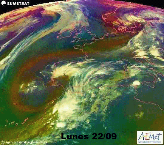 Se vé muy bien en las imágenes del satélite Meteosat, como gira sobre la península aportando grandes nucleos nubosos….(en rojizo-morado….aire frío……en azul-verdoso…aire más cálido).