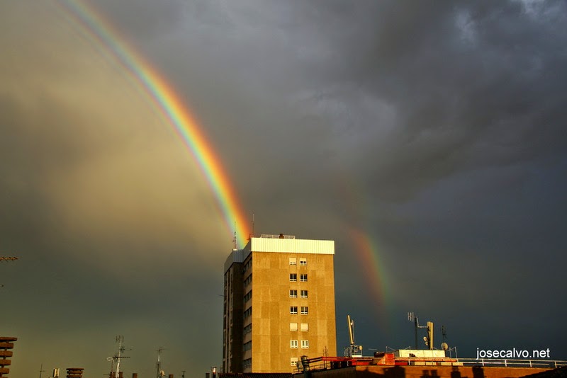 Esta pasada tarde, y debido a este tiempo tan revuelto y otoñal que estamos viviendo, se ha producido una corta pero intensa tormenta, que ha dejado 13 litros en poco más de una hora en Logroño y como ya sabéis…..tras la tormenta llega la calma……y muchas veces con la calma….el arco iris…..como el que hemos podido disfrutar tras ella….