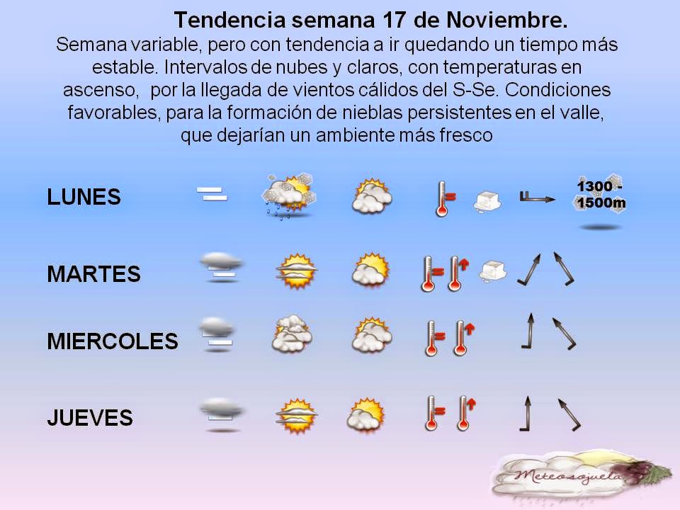 Esta semana que entra, vamos a continuar con tiempo otoñal, variable pero  más estable y además con un ascenso de las temperaturas máximas, lo único que tendremos que tener en cuenta es la posible aparición de nieblas, que en el valle pueden ser persistentes, y que dejarían grandes contrastes entre las zonas bajas del valle y las zonas altas de montaña.