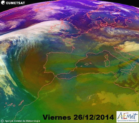 …y todo débido a la llegada de un frente muy activo tras el cual llegaba aire frío….así podemos observarlo en las imágenes del satélite Meteosat….fijaos en el aire frío (color rojizo) que aparece detrás del frente….