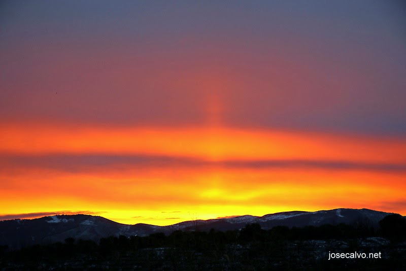 Si os fijáis, justo encima del sol, podemos observar una luminosidad que asciende en vértical, este fenómeno optico se denomina Pilar Solar o Pilar de Luz.