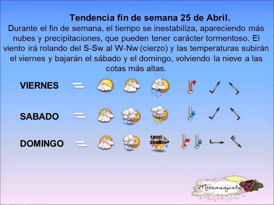 Así que ya véis, aunque comenzaremos el viernes con nubes altas y casi calor, pero se va a ir inestabilizado la situación, con la aparición de chubascos, algunos tormentosos y descenso de temperaturas que notaremos sobre todo el domingo por la tarde, con la llegada de vientos del Nw.