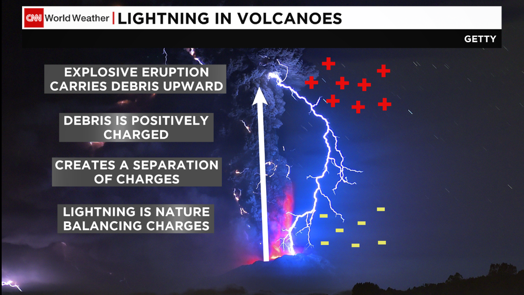 esto es debido a las características propias de la nube con su diferentes cargas, positivas en el tope y negativas en la base, a lo que se suma la gran cantidad de partículas de ceniza que contienen, y que en su choque de unas con otras, generan abundante carga eléctrica.