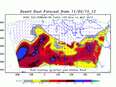 Todo ello ha sido debido, a la llegada de una masa de aire muy cálido de origen africano, que además ha venido acompañado de mucho polvo en suspensión….fijaos en la animación de estos días pasados….donde en colores más oscuros se señala la concentración de polvo…