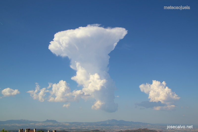 Fijaos en este cumulonimbo del domingo por la tarde, como se apreciaba desde el satélite y como se veía sobre Logroño..