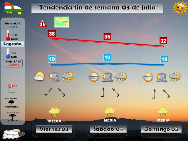 Fruto del calor acumulado se forma una baja relativa, que favorece la formación de tormentas de tarde y el aporte de vientos cálidos del Se, que pueden ponerse en contacto, con ese flujo suave del norte que afectará al Cantabrico durante el fin de semana.