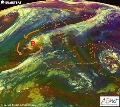 Y en esta animación podéis ver a la causante….esa bonita borrasca que con su giro ciclónico se ha situado en el Cantábrico y favorece la llegada de esos vientos más húmedos y frescos…