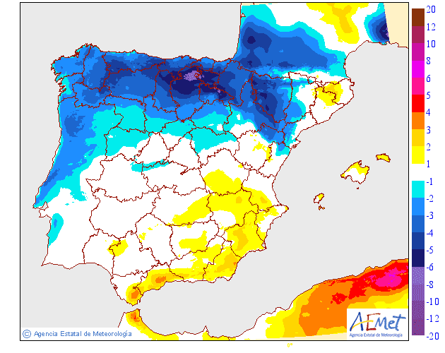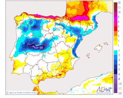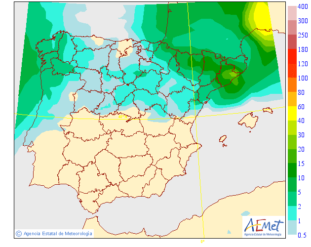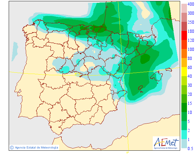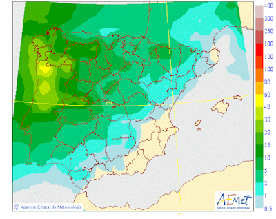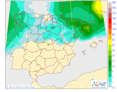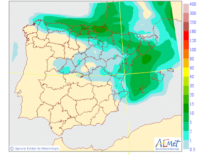 Se esperan precipitaciones, en forma de chubascos débiles y dispersos de distribución irregular, pero con mayor probabilidad en las laderas de la Ibérica orientadas a los vientos dominantes que serán del Sw.