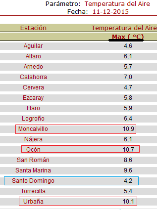 Fijaos como curiosidad que las temperaturas máximas se están dando en las zonas más altas de la comunidad….mientras que en el valle se han mantenido más frescas….es decir se esta produciendo una Inversión Térmica que favorece la formación de estas nieblas…