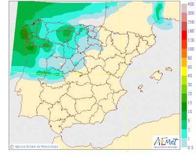 Se pueden producir precipitaciones débiles asociadas a la llegada del frente, con mayor probabilidad en zonas de la Ibérica occidental. Poquita cosa porque llegará debilitado
