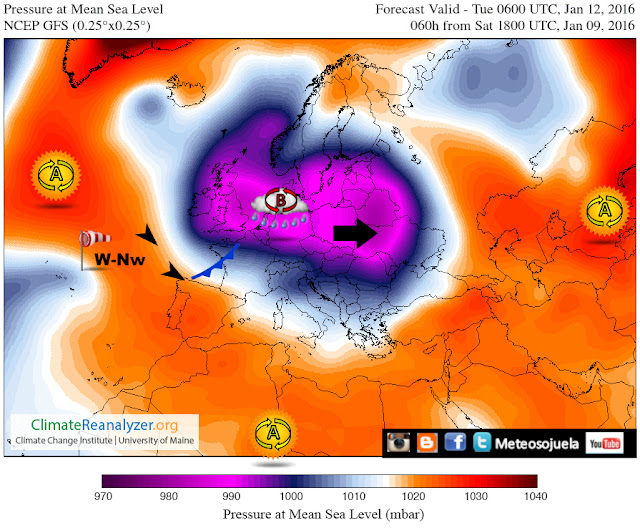 …hacia el miércoles-jueves se produce una situación puntual con formación de una baja en el Cantábrico que de nuevo impulsará vientos algo más cálidos del W-Sw…