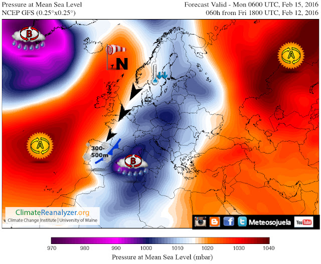 LUNES 15 DE FEBRERO: AMBIENTE INVERNAL CON VIENTOS DEL NW SOPLANDO FUERTES Y ACUMULANDO NUBOSIDAD QUE DEJARA PRECIPITACIONES SOBRE TODO EN LA IBERICA. TEMPERATURAS EN DESCENSO CON HELADAS GENERALIZADAS. AVISOS NARANJAS Y AMARILLOS POR VIENTO Y NIEVE