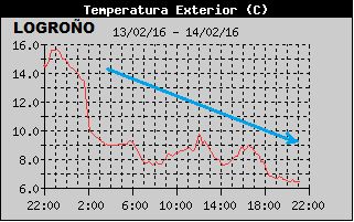 Las temperaturas alcanzaban los 20ºC !!! en Alfaro este sábado debido a esos vientos templados del Sw que han alcanzado rachas de 125Km/h en Valdezcaray, sin embargo, fijaos como ha evolucionado la gráfica de temperaturas en Logroño con la entrada de los vientos fríos del Nw…