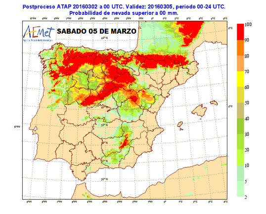 Fijaos en la probabilidad estimada por AEMET…100% en la Ibérica y menos probable en el valle