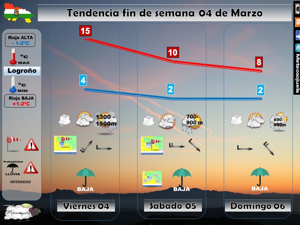 VIERNES 04 DE MARZO : NUBES Y CLAROS, CON TENDENCIA A CUBRIRSE. PRECIPITACIONES AL FINAL DEL DIA, COINCIDIENDO CON DESCENSO DE TEMPERATURAS, QUE HABRÁN SIDO SUAVES DEBIDO A LOS VIENTOS DEL SW-W, QUE SOPLARAN FUERTES EN LA IBERICA, AVISO AMARILLO.