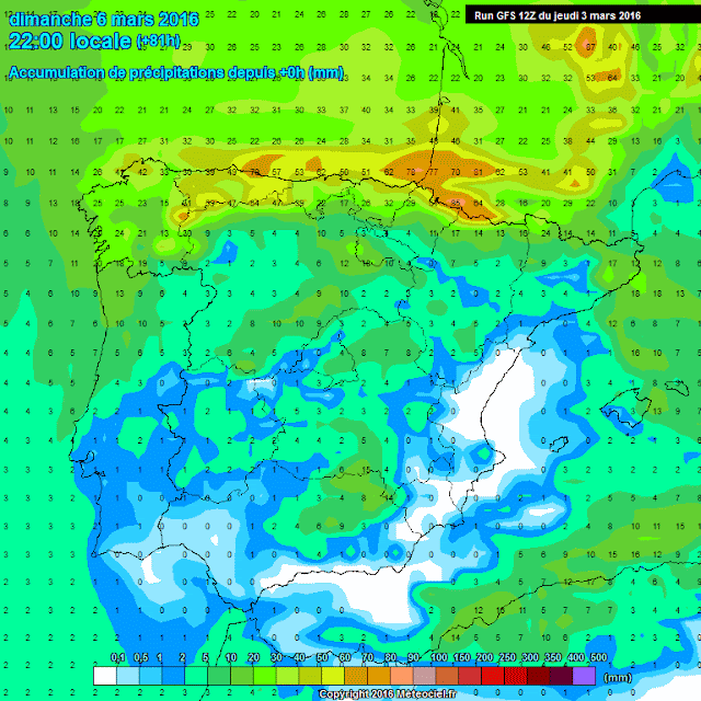 En el mapa de acumulacion se puede ver que rondará los 20 litros en la Ibérica y los 5 litros en el valle