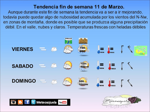 Así que ya véis, nos espera un fin de semana con tendencia a ir mejorando. Aunque los vientos del N-Nw todavía pueden dejar nubosidad y alguna precipitación débil en zonas de montaña, mientras que en el valle predominarán los claros sobre las nubes. Temperaturas frescas.