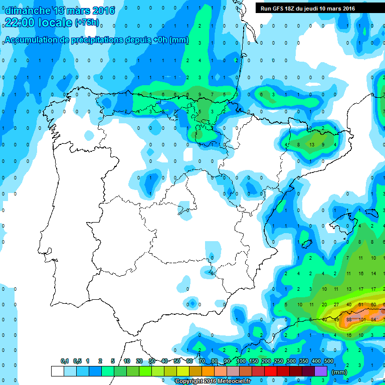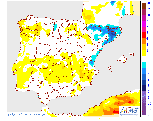 Se pueden producir precipitaciones débiles y dispersa. Con más probabilidad en la Ibérica y zona occidental ,asociadas a las nubes retenidas