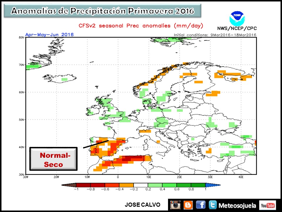Y en cuanto a precipitación.….se espera una primavera algo más seca de lo que sería normal en nuestra región…