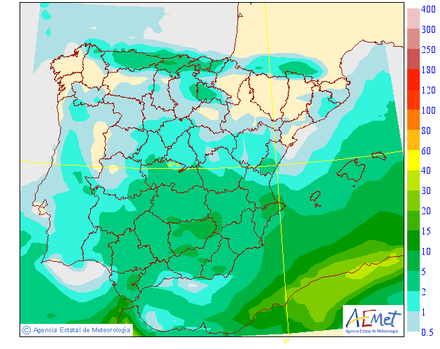 En los modelos de precipitación acumulada, es decir, los que valoran la cantidad de lluvia que caerá durante esta semana nos indican que las mayores cantidades se esperan en la Ibérica con acumulados de alrededor de 20 litros, y en el valle rondarían los 5 litros.