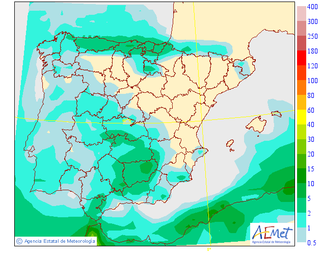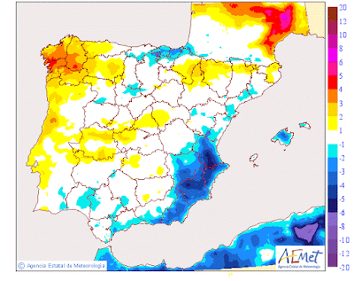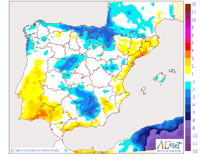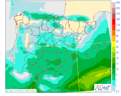 Se pueden producir alguna precipitaciones débiles asociadas a las nubes retenidas, en la Ibérica y zona Occidental.Poca cosa