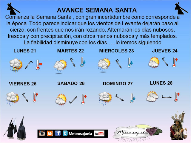 Así que ya véis, nos espera una Semana Santa revuelta en la que alternarán días de cielos nubosos, frescos y con precipitaciones, con otros más soleados y templados.