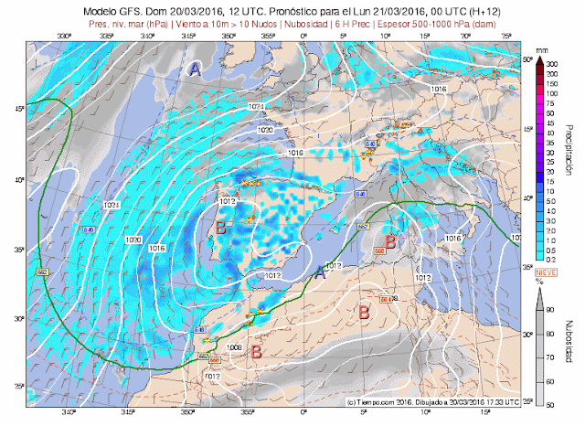 El embolsamiento de aire frío que esta dejando esta inestabilidad se desplaza por el Sur peninsular hasta llegar al Mediterráneo donde generará una borrasca que va a favorecer la llegada de vientos fríos del N-Nw. (típico Cierzo en nuestra región)
