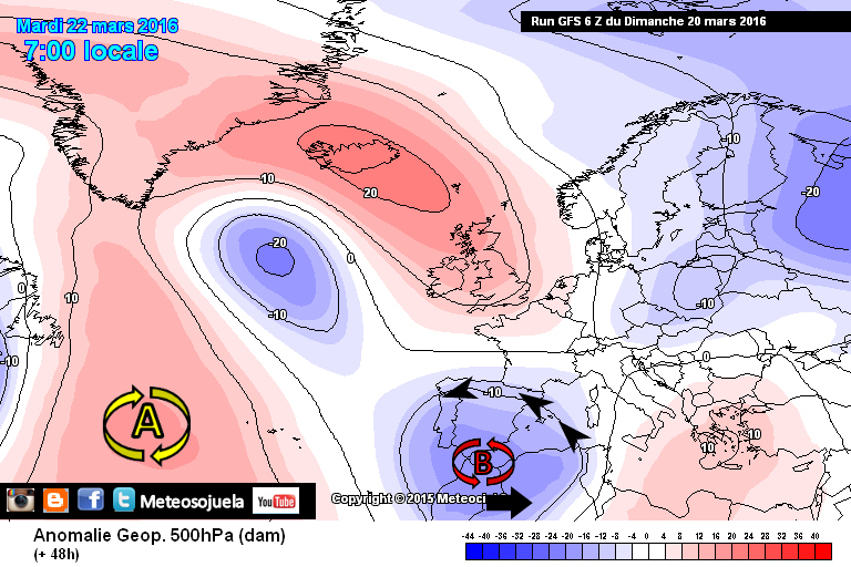 El anticiclón de las Azores se insinua en el Atlántico y el aire frío en altura genera una borrasca en el Mediterráneo. Entra ambos centros de presión vientos del N-Nw más fríos.