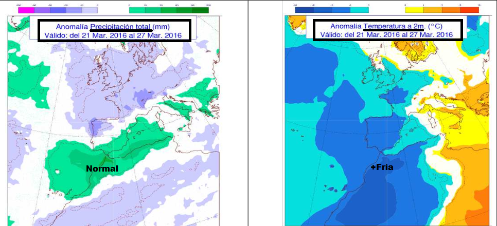Según AEMET…, pronóstica una Anomalía fría, respecto a temperatura y normal, respecto a precipitación en nuestra región.