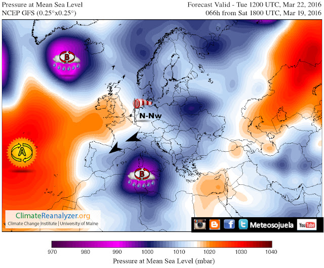 Entre el anticiclón y la borrasca se siguen canalizando vientos del N-Nw