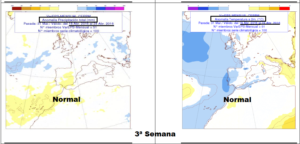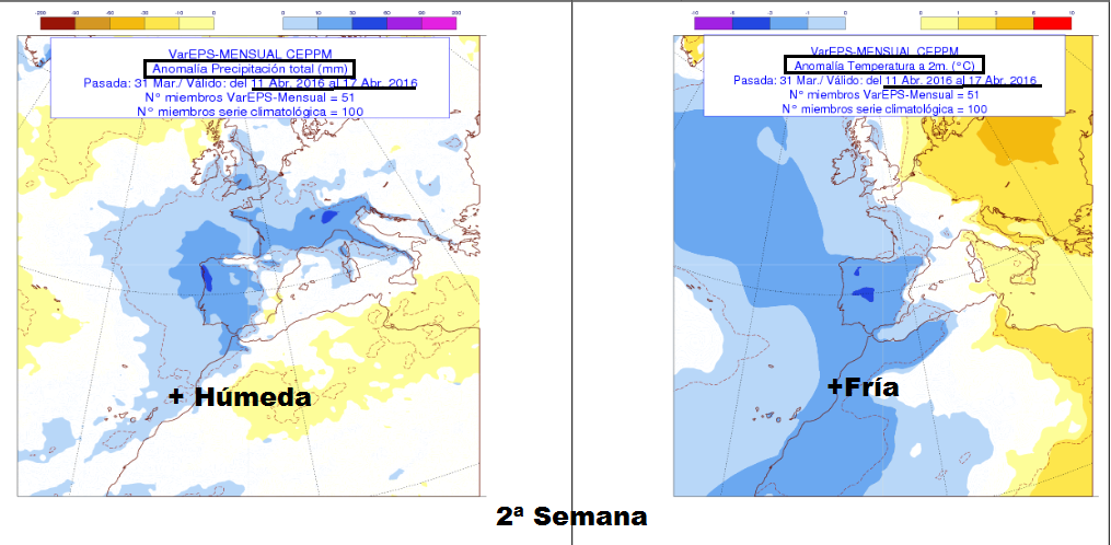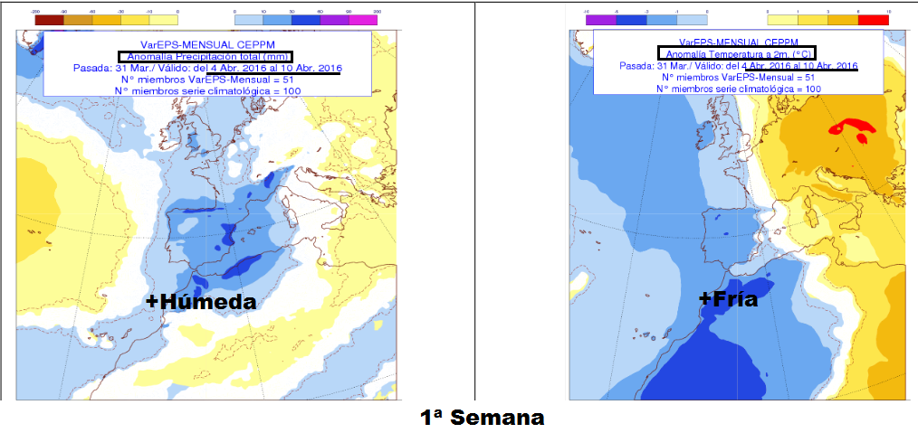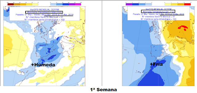 Teniendo como base de predicción los datos recogidos durante la última semana de Marzo, estos modelos pronostican en nuestra región un mes de Abril más frío en cuanto a temperatura y más húmedo en cuanto a precipitación.