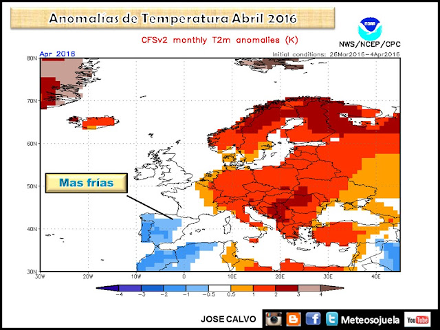 Lameteo.org que en sus pronósticos utiliza las previsiones estacionales de varios modelos americanos y europeos nos dice que Abril sería más frío y más húmedo de lo habitual