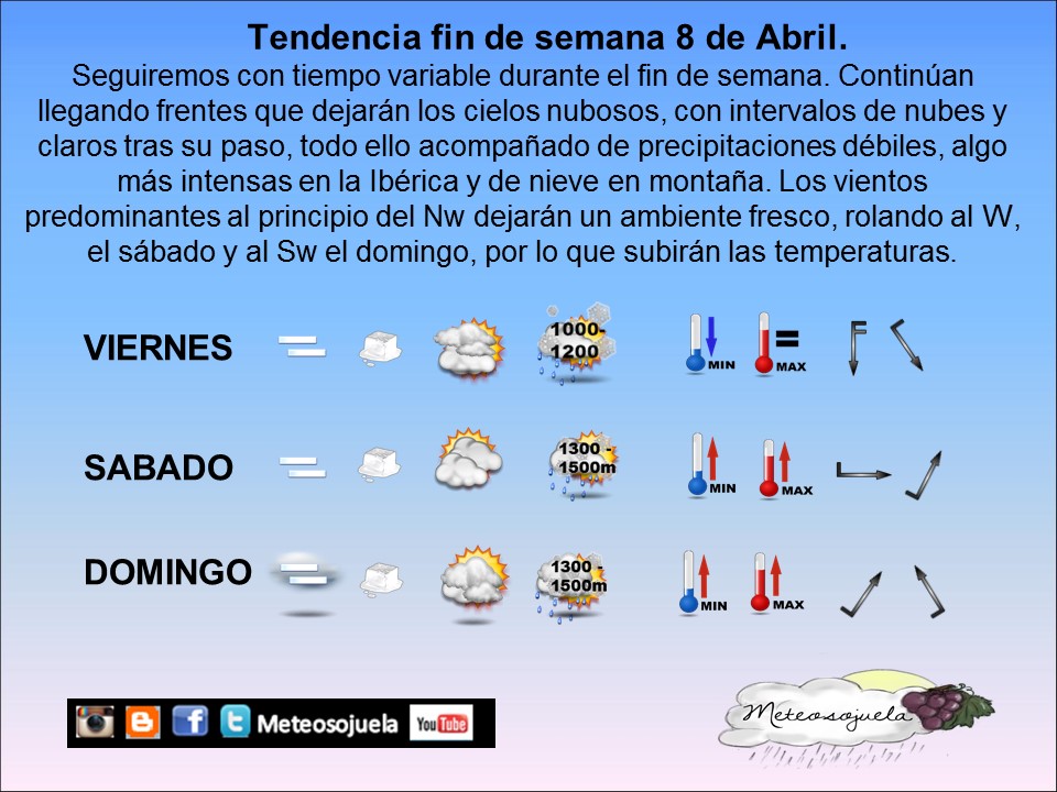 VIERNES 08 DE ABRIL : SITUACION TIPICA DEL NW CON VIENTOS SOPLANDO MODERADOS, NUBOSIDAD ABUNDANTE Y PRECIPITACIONES DEBILES. MAS CLAROS EN RIOJA BAJA. TEMPERATURAS FRESCAS CON HELADAS DEBILES
