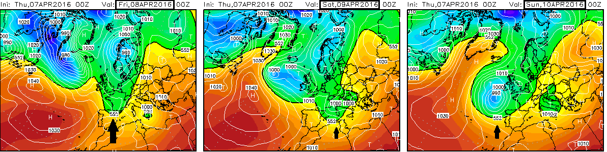 El sábado sería un día de transición entre el anticiclón que se desplaza y una profunda borrasca se descuelga quedando posicionada el domingo frente a las costas gallegas. Aún así seguirán llegando frente