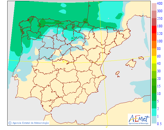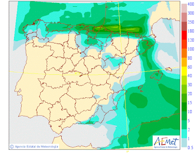 Se pueden producir precipitaciones débiles y dispersa. Con más probabilidad en la Ibérica y zona occidental ,asociadas a las nubes retenidas y a los frentes que irán llegando