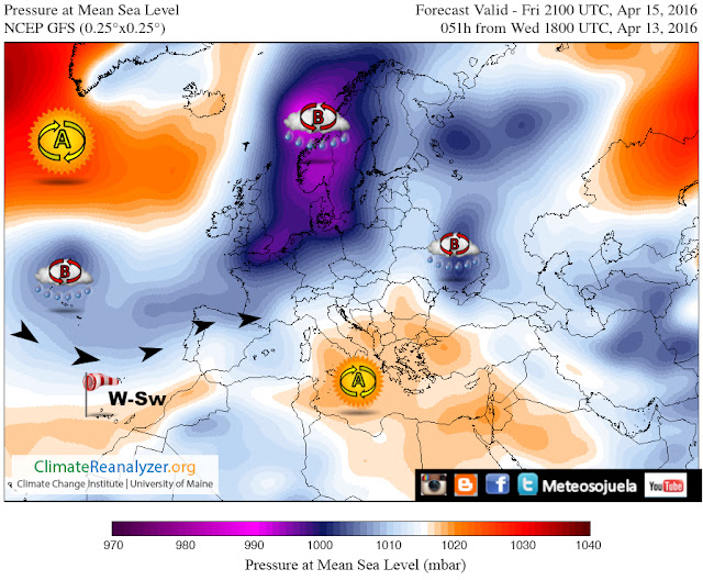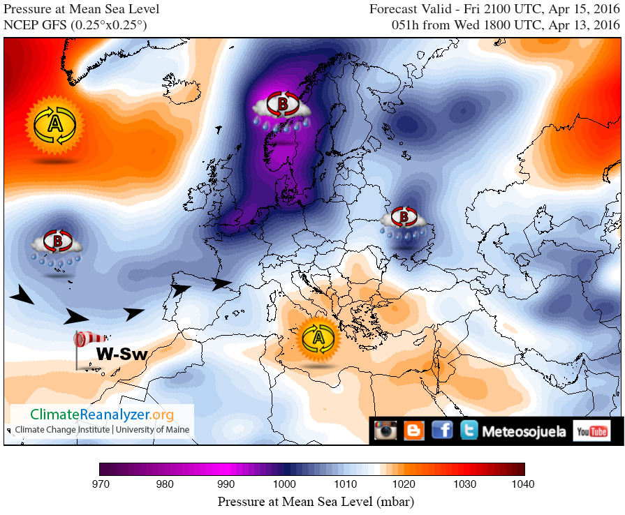 Las altas presiones están alejadas con un centro en Terranova y otro en el Mediterráneo. Vientos dominantes del Sw.