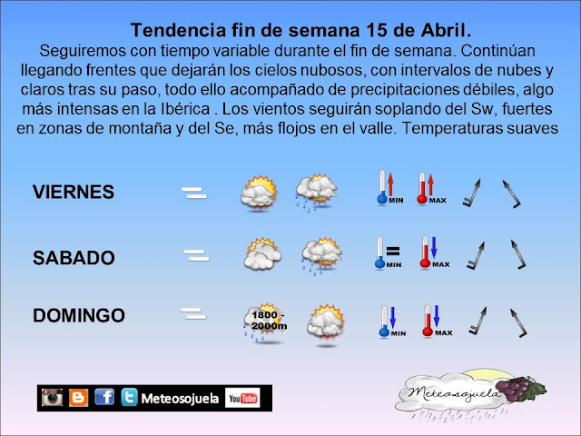 Así que ya véis, continuamos con tiempo revuelto por frentes debilitados que irán llegando a nuestra región, dejando alternancia de períodos nubosos con otros menos nubosos. Los vientos seguirán predominando del Sw por lo que el ambiente será cálido, solo el domingo puede refrescar algo