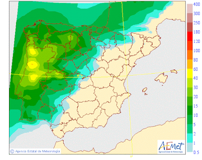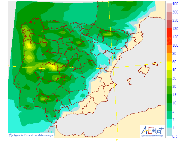 En los modelos de precipitación acumulada observamos como las mayores cantidades se producen en la zona Occidental, siendo mñas dispersas en el resto. Cantidades que oscilarán entre los 10-15 litros en la Ibérica y 3-5 en el valle.