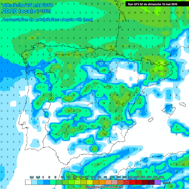 En los mapas de precipitación acumulada observamos que se puede producir alguna precipitación débil sobre todo en la Ibérica. Estarían asociadas a un frente que nos roza el miércoles por la tarde y algo de duda acerca de posible inestabilidad el fin de semana. Pero poca cosa parece.
