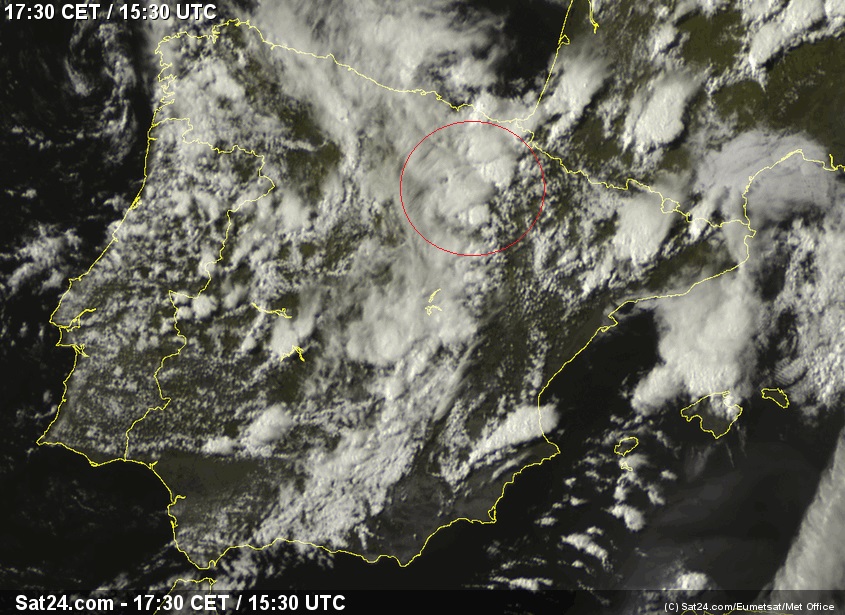 Como ya decíamos en la anterior previsión la borrasca atlantica que se había mantenido en el Mediterráneo acabaría cruzando la península junto a un embolsamiento de aire frío en altura que favorecía la inestabilidad y formación de tormentas.