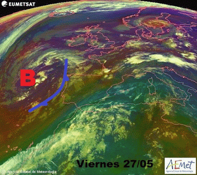 Fijaos en el giro ciclónico de la borrasca,con el aire frío en color rojizo y la parte delantera dela vaguada más activa que es donde se generan la mayor parte de las tormentas.