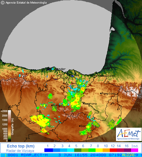 y así se veía ya el frente de tormenta entrando por las estribaciones de a Ibérica y bajando hacia el valle del Ebro..