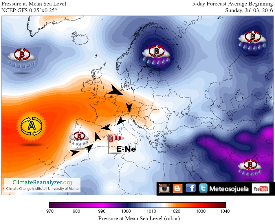 A nivel de superficie observamos como predominan las altas presiones, pero como debido al calor que se va acumulando se genera una baja relativa responsable de la inestabilidad de las tardes.Vientos dominantes de Levante
